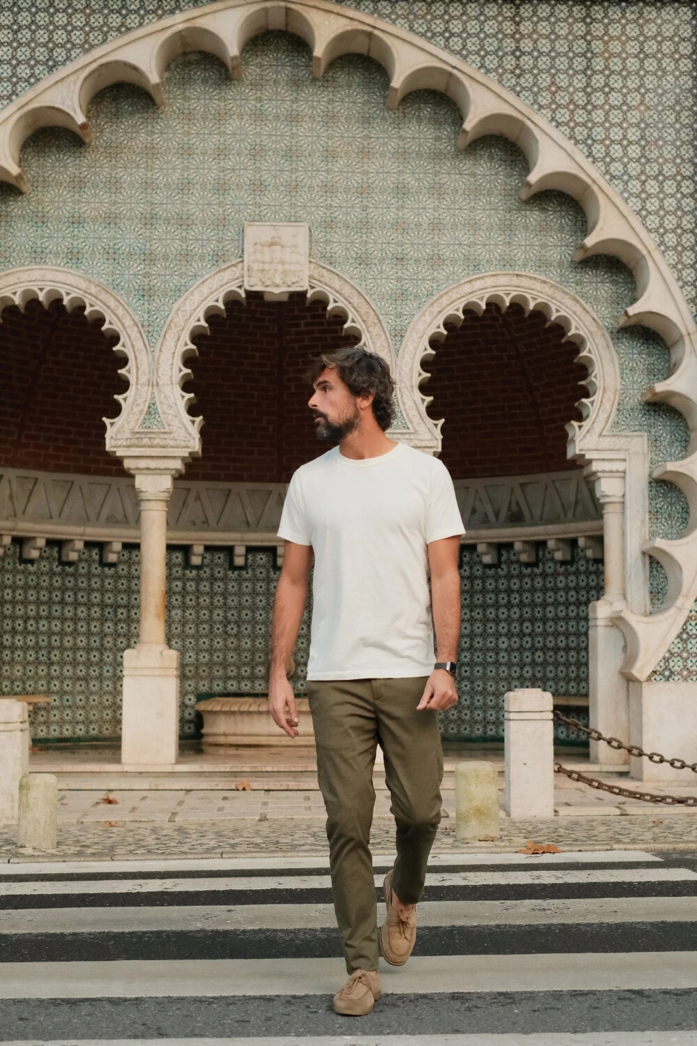 A Elastic Motion Chino nasceu da vontade de criar um essencial que unisse o melhor dos dois mundos — a elegância natural de uma chino clássica e o conforto de um tecido que se move com você.