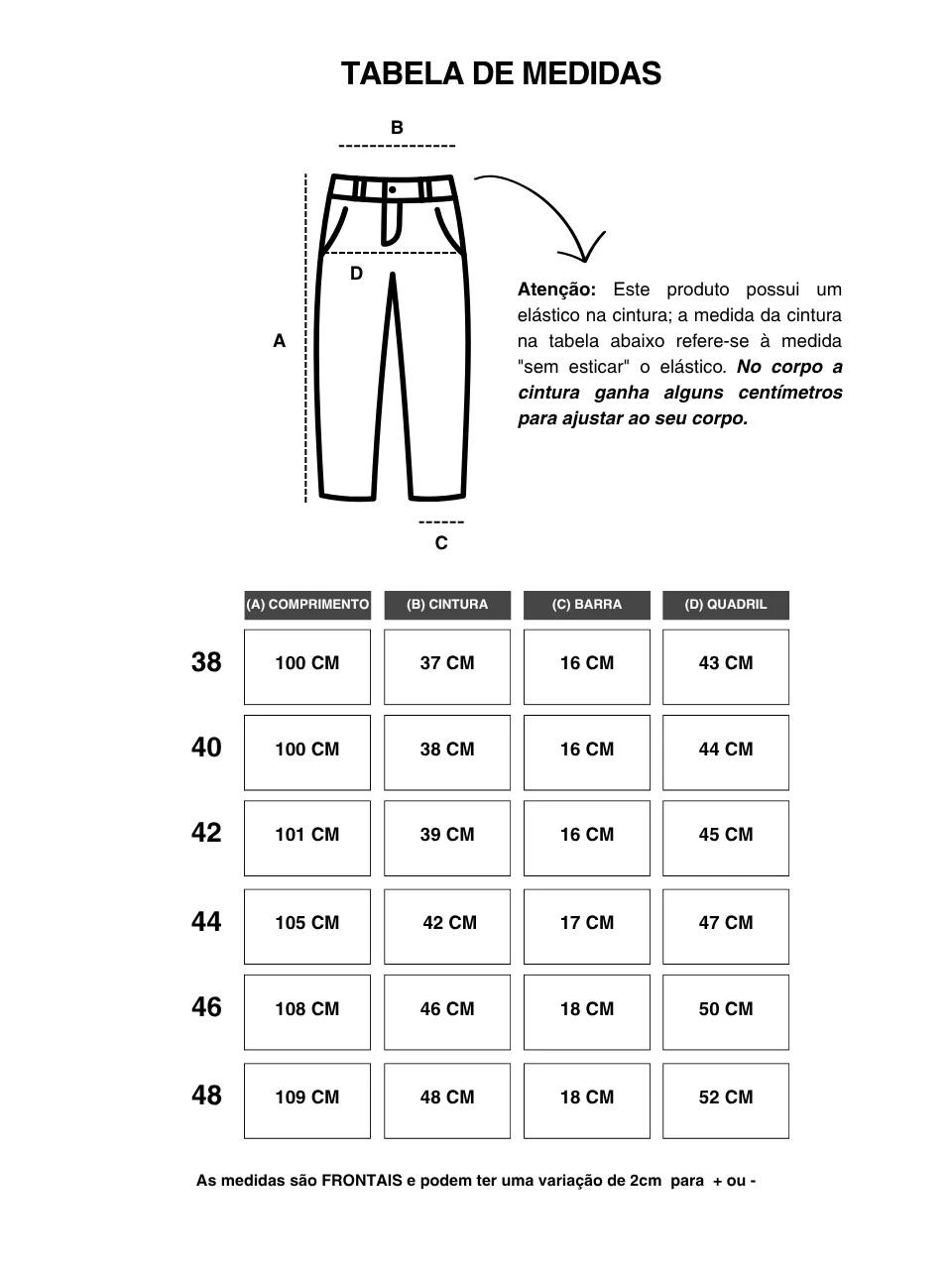 Conforto Personalizado: O elástico parcial no cós (somente na parte traseira) oferece flexibilidade, proporcionando um ajuste perfeito, tanto em pé quanto sentado. É a combinação ideal de estilo e conforto para o seu dia a dia.