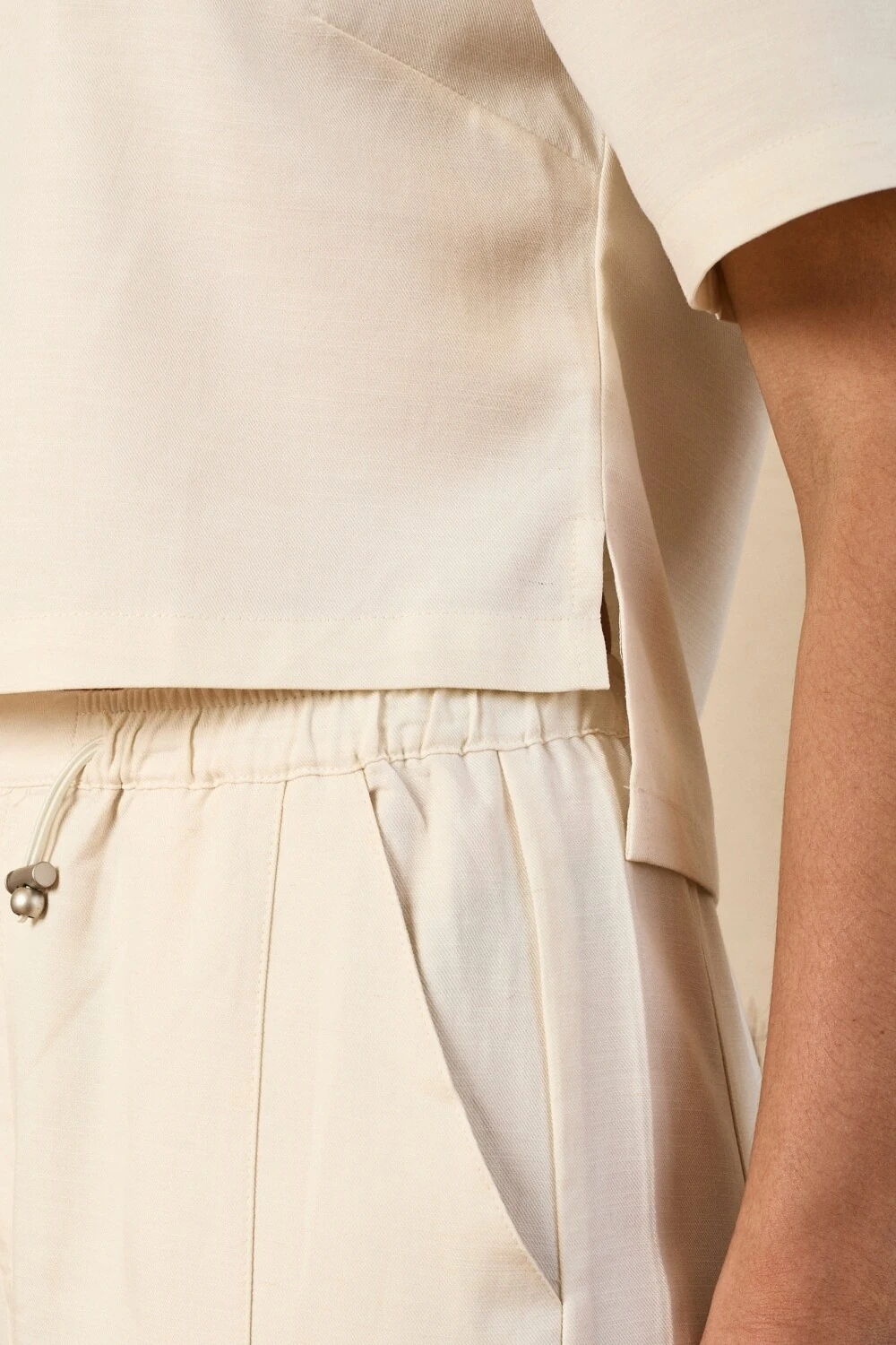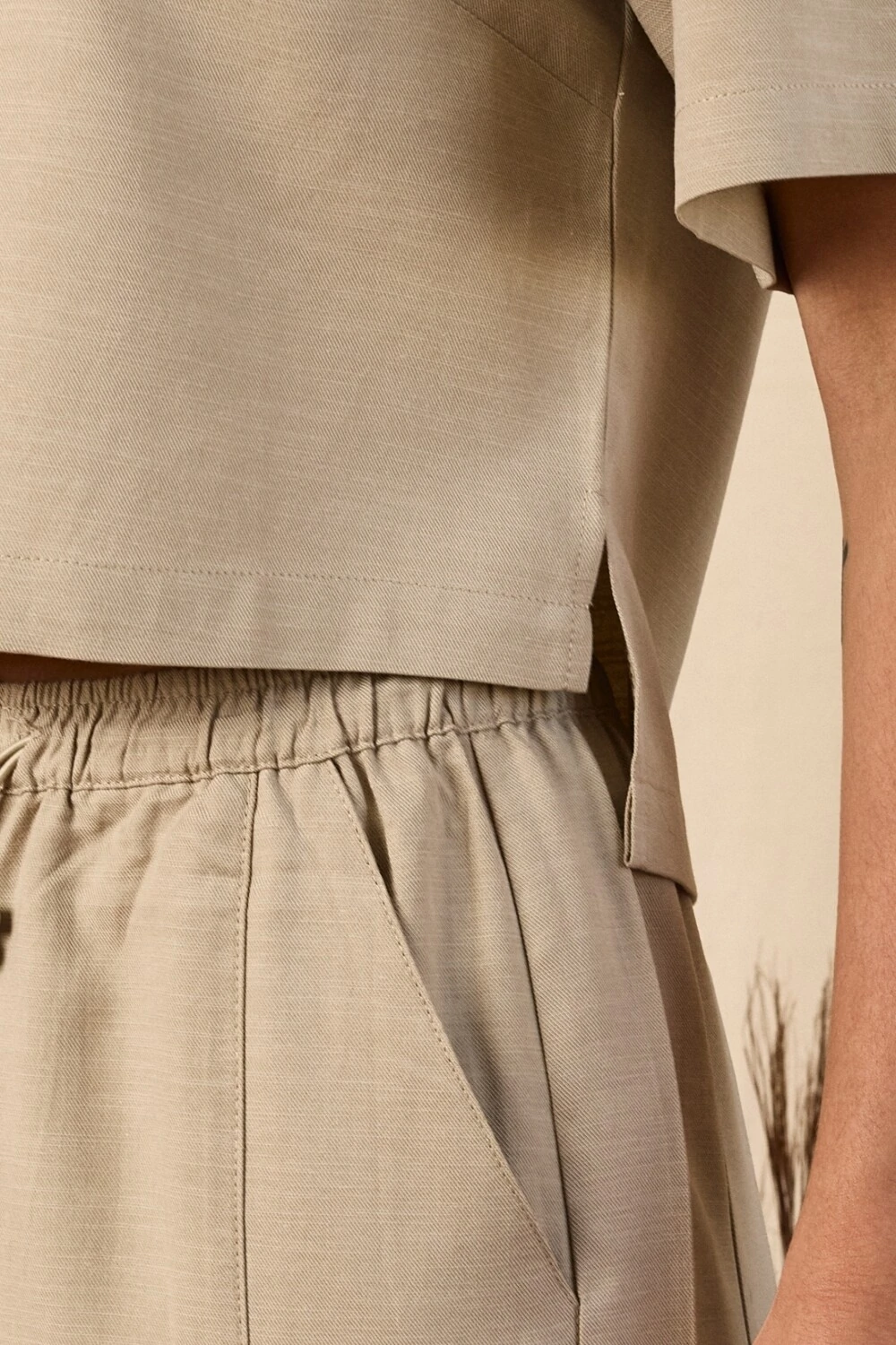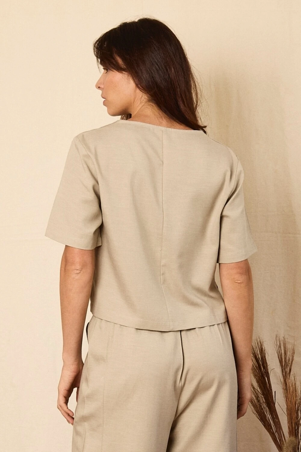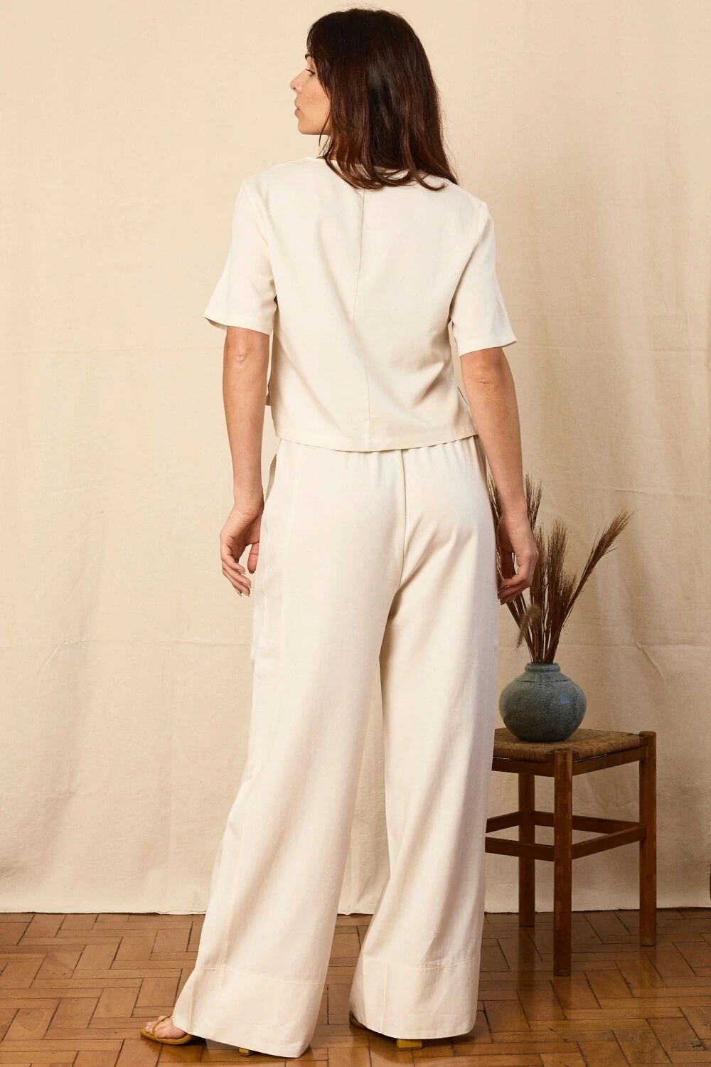 Com corte relaxed e decote em “V” que valoriza o colo de forma delicada, ela é feita em um tecido com textura fina e toque suave — uma fusão equilibrada entre liocel, algodão e linho.
