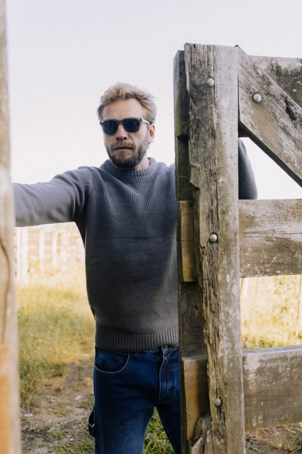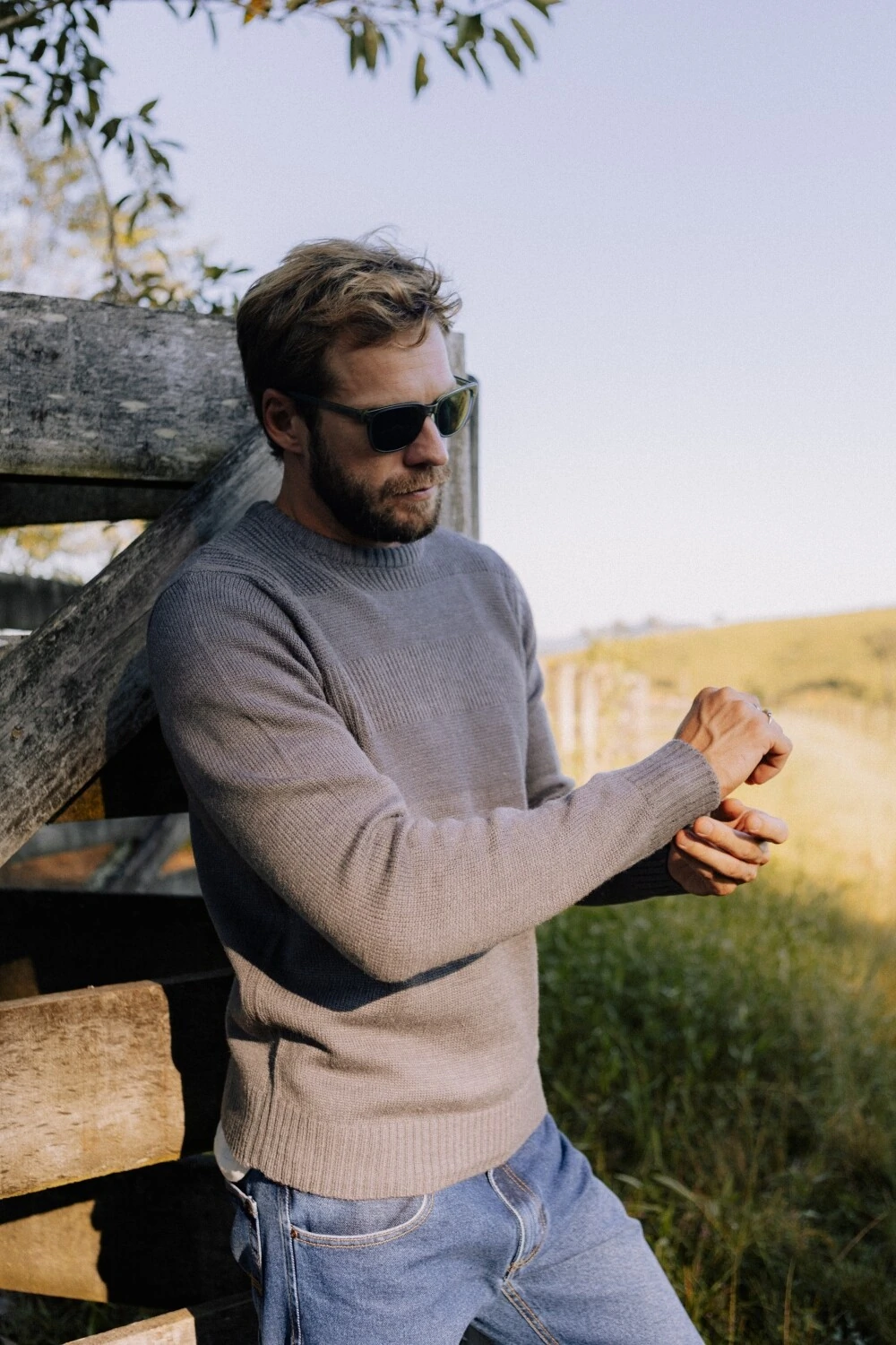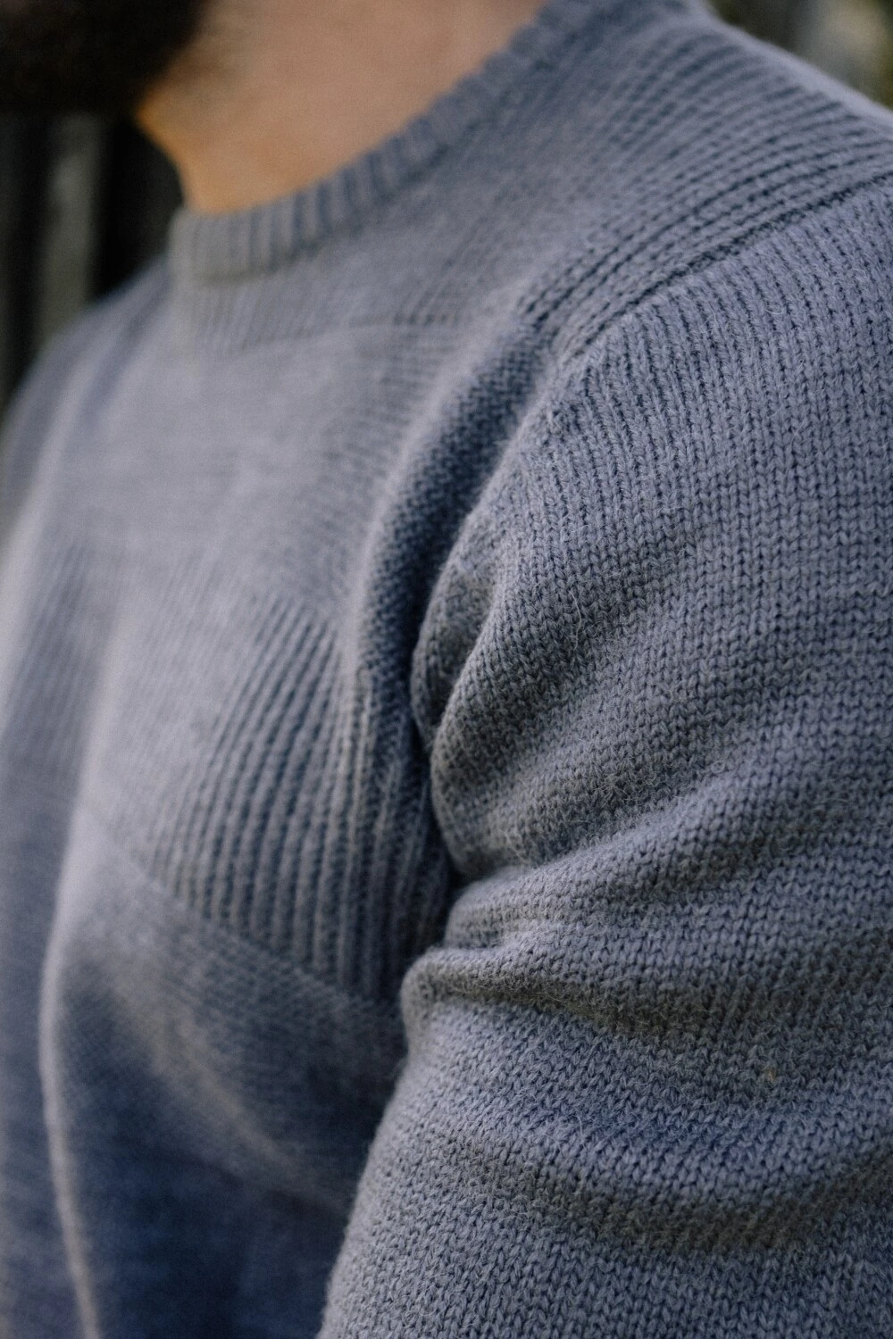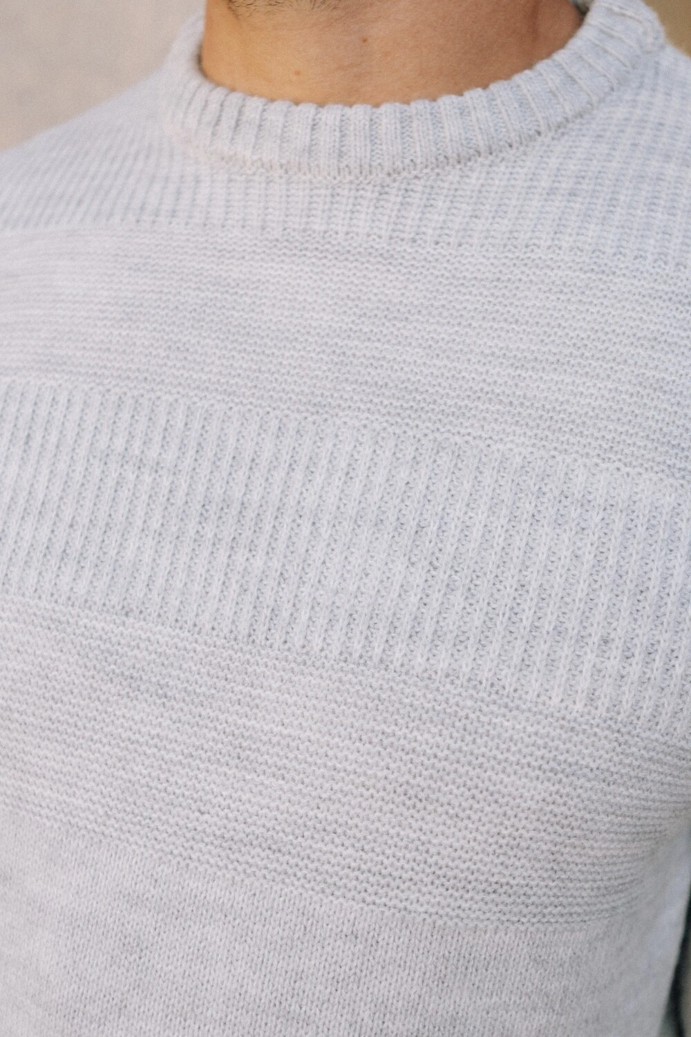 Tricô de peso médio, com superfície levemente felpada que traz conforto desde o primeiro uso. A construção apresenta variações sutis de textura em linhas horizontais, criando profundidade sem marcar excessivamente a peça. A composição em 70% acrílico e 30% lã equilibra retenção de calor, toque macio e estabilidade ao longo do tempo. Gola redonda com acabamento limpo. Punhos e barra canelados mantêm a estrutura no corpo.