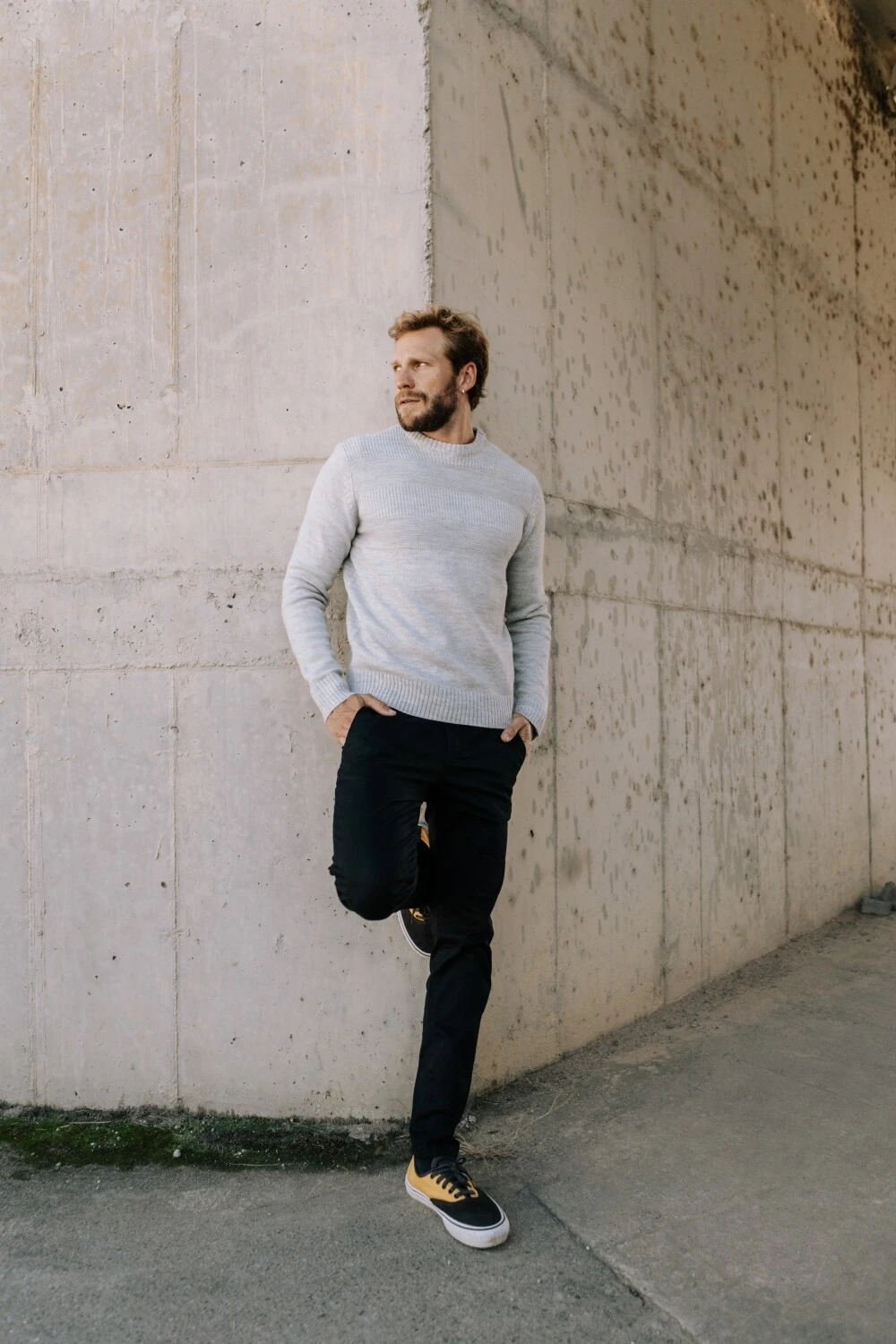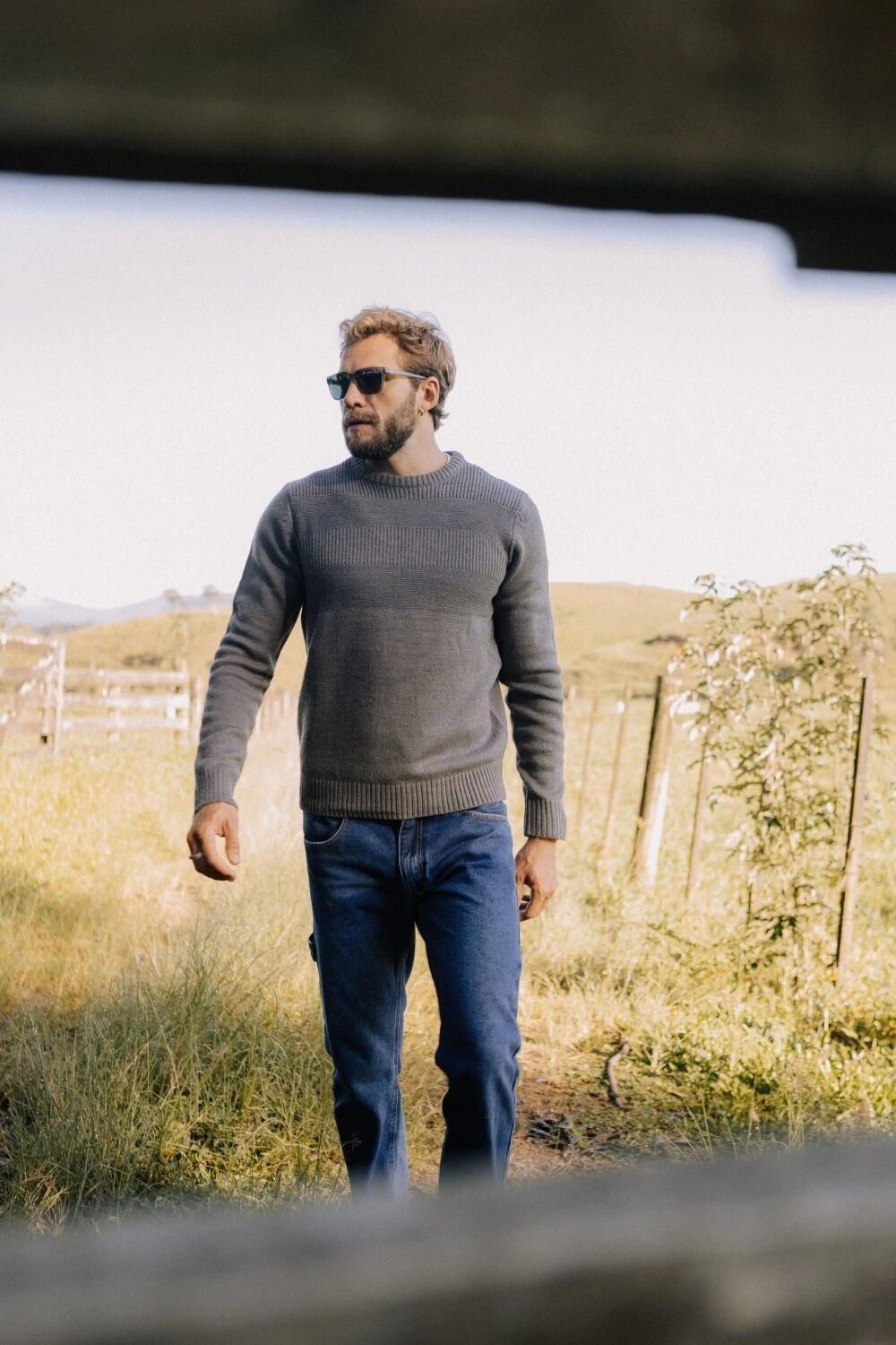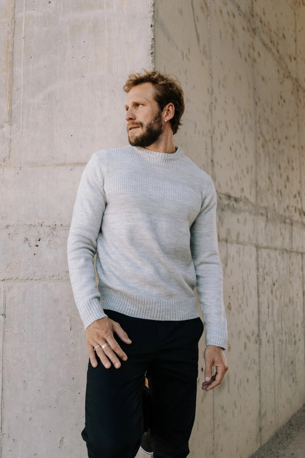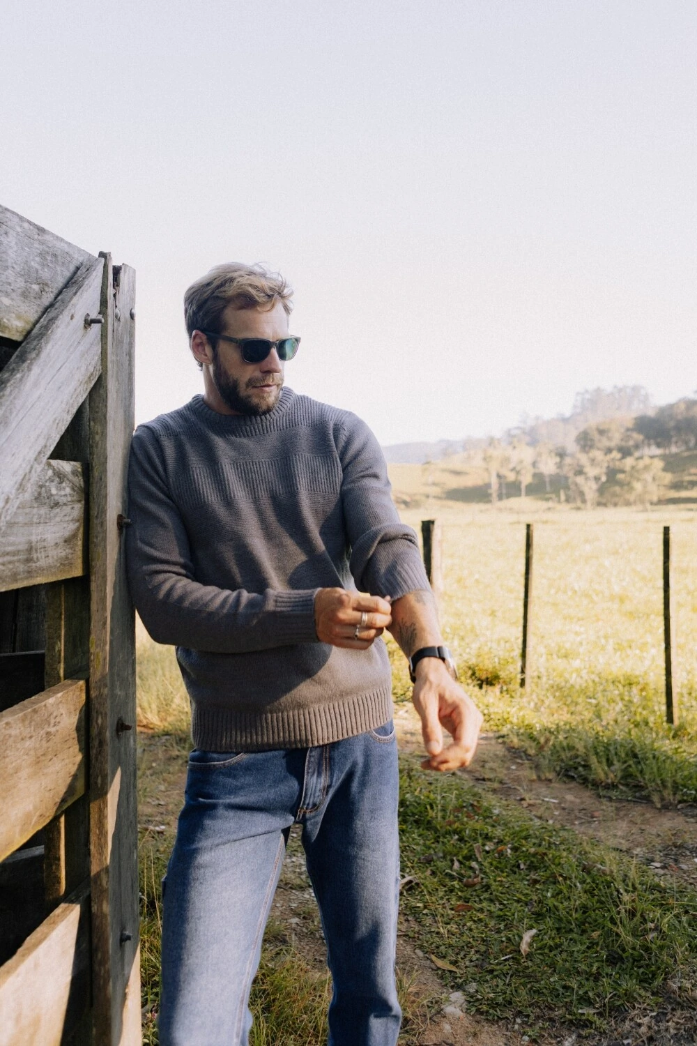 Tricô de peso médio, com superfície levemente felpada que traz conforto desde o primeiro uso. A construção apresenta variações sutis de textura em linhas horizontais, criando profundidade sem marcar excessivamente a peça. A composição em 70% acrílico e 30% lã equilibra retenção de calor, toque macio e estabilidade ao longo do tempo. Gola redonda com acabamento limpo. Punhos e barra canelados mantêm a estrutura no corpo.