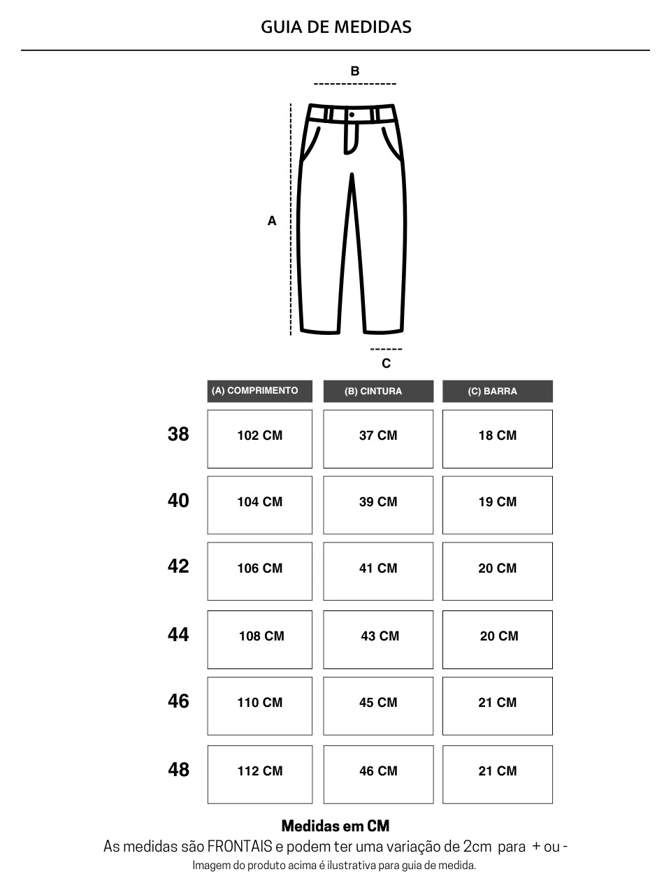 Modelagem reta, com espaço confortável nas pernas. Mantém estrutura sem apertar.
